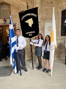 Στο πλαίσιο του εορτασμού της Εθνικής μας Επετείου πραγματοποιήθηκε η ανακήρυξη των σημαιοφόρων και παραστατών, που θα εκπροσωπούν με τιμή και ευθύνη το Παγκύπριο Λύκειο Λάρνακας. Δίπλα από το λάβαρο του σχολείου μας κυμάτισαν περήφανες, πλάι πλάι, η ελληνική και η κυπριακή σημαία, υπενθυμίζοντας ότι τα ιδανικά της ελευθερίας και της αξιοπρέπειας παραμένουν οδηγός της νέας γενιάς.